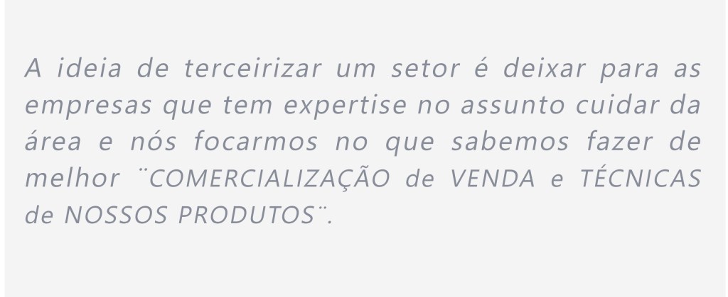 Já havia na empresa serviços terceirizados específicos, como por exemplo a Tecnologia da Informação (TI) que a princípio tínhamos a ideia de trazer para dentro da empresa, mas optamos por dar continuidade no contrato considerando a boa evolução da parceria. Outra terceirização que vem dando certo é o setor de limpeza e higienização da empresa.