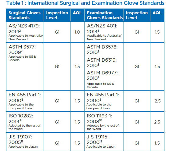 - Para luvas cirúrgicas: o AQL é de 0,65 (látex de borracha natural ou NRL) ou 1,0 (Sem látex), atendendo ou excedendo os padrões mundiais de 1,5;