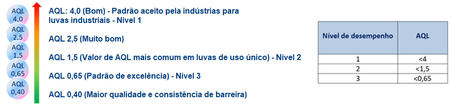O AQL é um padrão industrial e conforme citado é um processo de amostragem estatística para avaliar a qualidade, isto é, refere-se ao nível de defeitos que podem ser aceitos em um lote de produção de luvas. Dentro deste conceito também estão atrelados diversos fatores como durabilidade/vida útil, desempenho, produtividade e custos.
