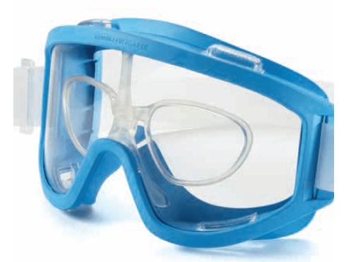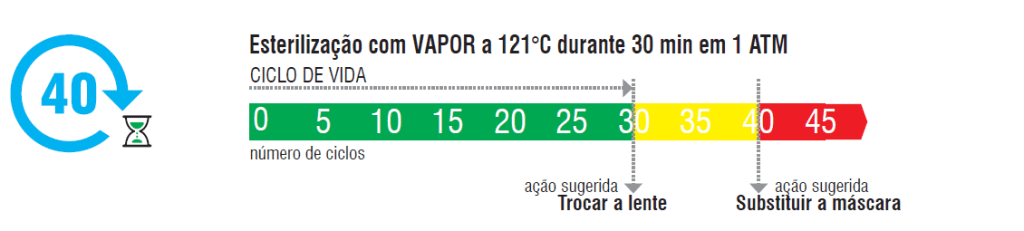 Máscara com lentes de policarbonato reutilizáveis até 40 ciclos de 30 minutos em autoclave com vapor a 121° C.