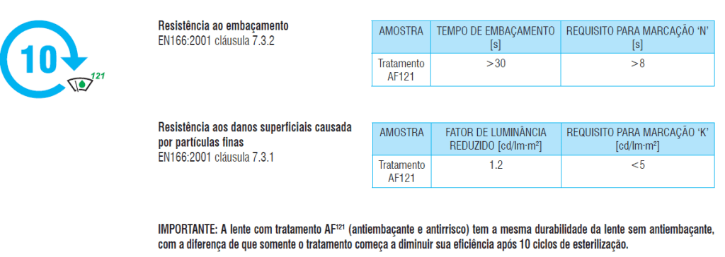 O tratamento AF121 (tratamento com antirrisco e antiembaçante) aplicado às lentes previne arranhões e embaçamento, suportando até 10 ciclos de 30 minutos em autoclave com vapor a 121° C.