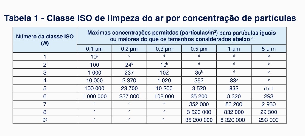 A classificação das salas limpas e a quantidade máxima permitida de concentrações permitidas em cada sala pode ser conferida na tabela abaixo: